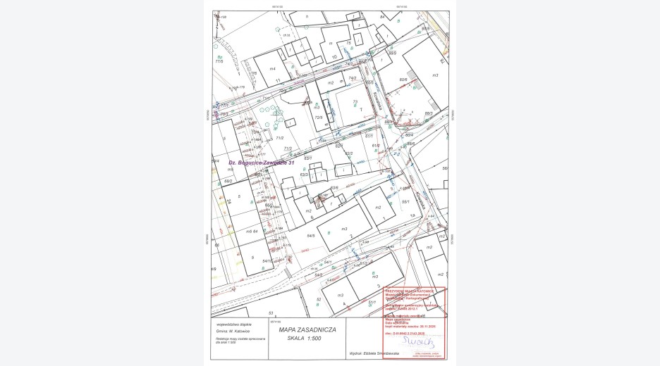 Nadto, z treści mapy zasadniczej wynika, że w granicach działki nr 63/6 usytuowane są przyłącza wodne oraz przyłącze kanalizacyjne. Przyłącza wodne (w tym nieczynne, częściowo położone na działce nr 63/3), stanowią własność Katowickich Wodociągów S.A., natomiast przyłącze kanalizacyjne nie jest własnością gestorów mediów.